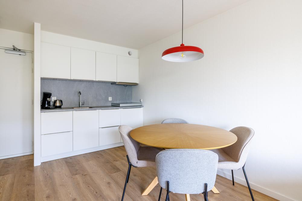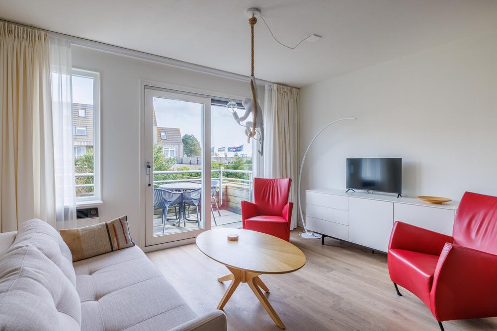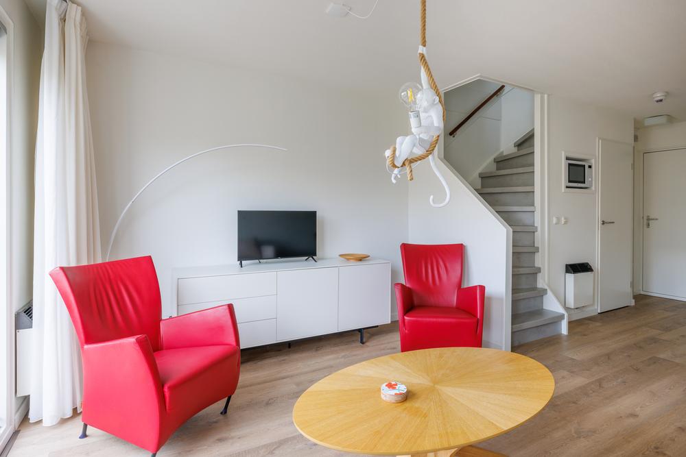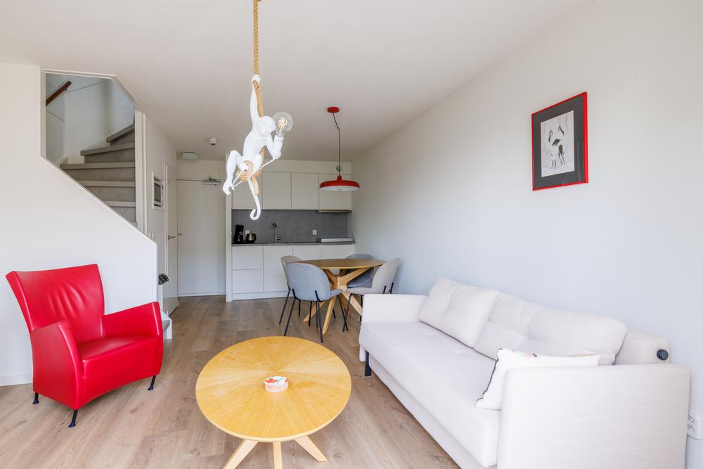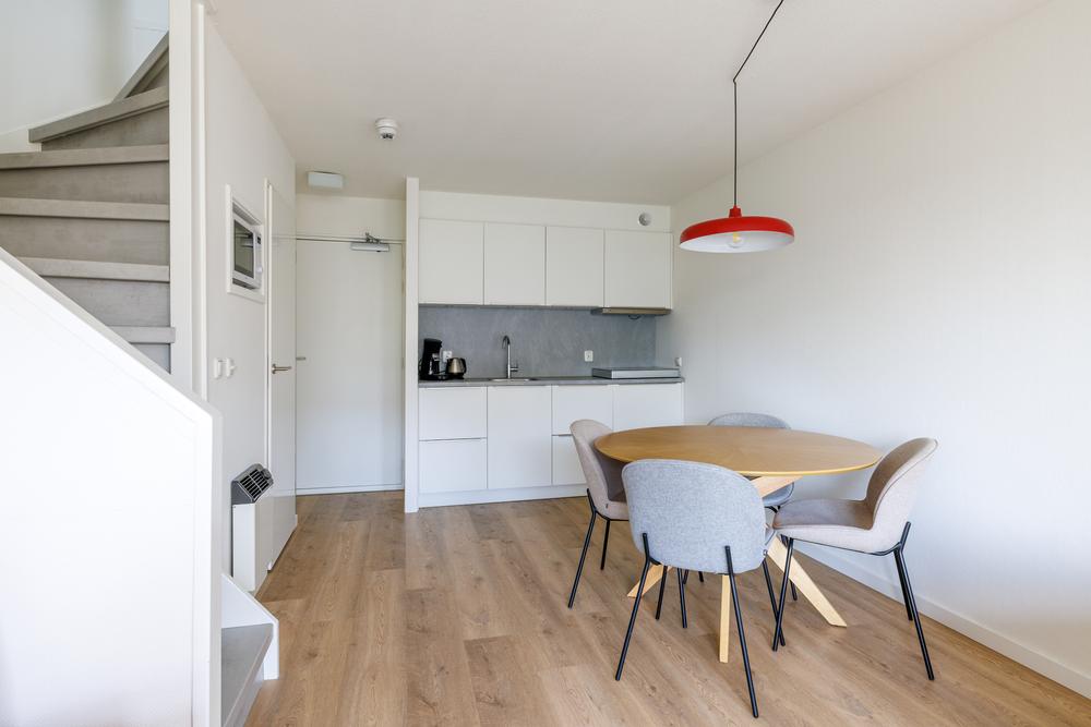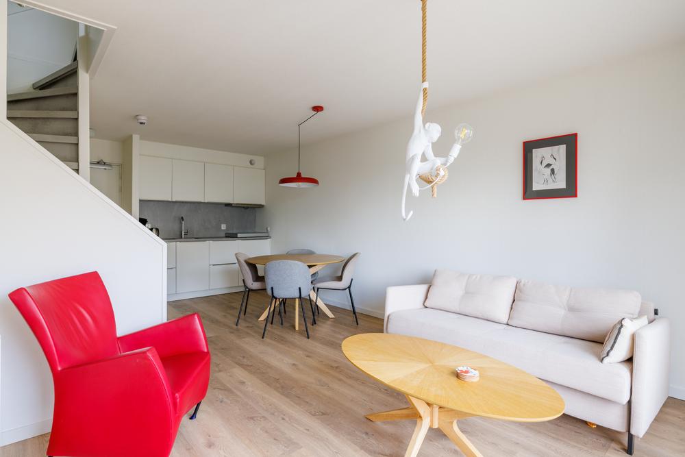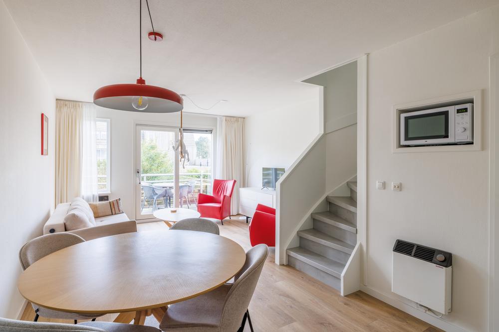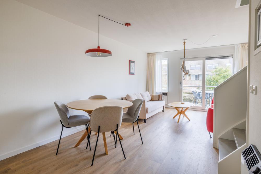 Op de woonverdieping komt alles mooi samen in een open en lichte leefruimte. De woonkamer met open keuken heeft door de grote schuifpui een directe verbinding met het balkon. De keuken is praktisch ingericht en voorzien van de benodigde apparatuur, ideaal voor zowel korte verblijven als langere vakanties. Daarnaast biedt de trapkast extra bergruimte – altijd prettig in een recreatiewoning.